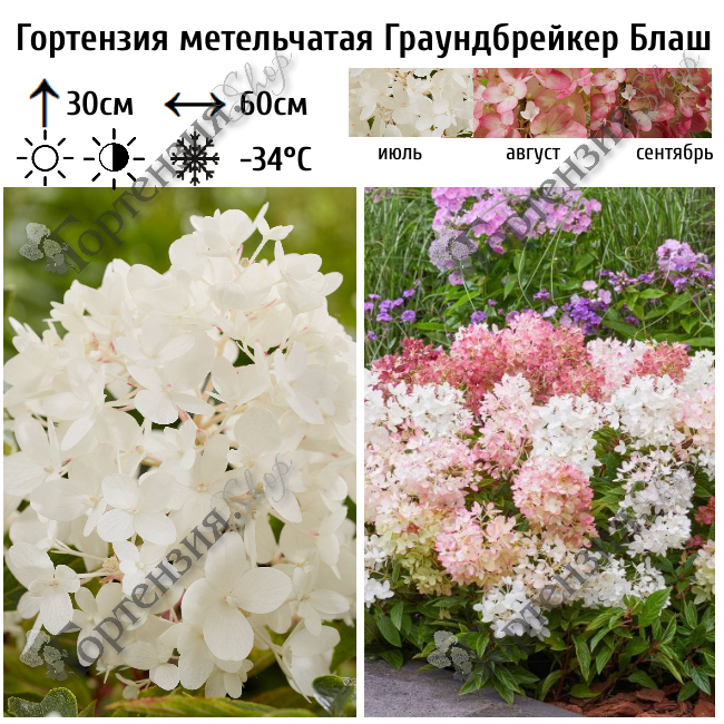 Новинка от Алекса Шумейкера из коллекции Living Creations®. Гортензия метельчатая Граундбрейкер Блаш почвопокровная, компактная гортензия высотой всего 30-40 см шириной до 60 см. Куст густой, соцветия конусовидные 15-20 см, нежные воздушные распускаются белыми цветами в июле, к концу сезона в сентябре-октябре темно-розовые. Стебли прочные. Этот компактный сорт подходит для низких живых изгородей, для выращивания в малых садах, как в открытом грунте, так и в кашпо. Морозостойкость до -34°C.
