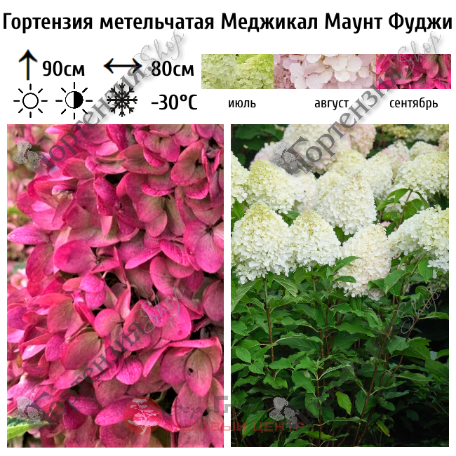 Гортензия метельчатая Меджикал Маунт Фуджи (Magical Mount Fuji) цветущий кустарник. Высота куста до 90 см, ширина до 80 см. Листья зеленые, побеги крепкие. Цветет с июля по сентябрь. Соцветия большие конические в начале цветения белые ближе к концу цветения малиновые. Почва должна быть кислая, влажная, но без застоя воды. Зимостойкость -30С. Используется для миксбордеров, небольших садов, и контейнерного выращивания.