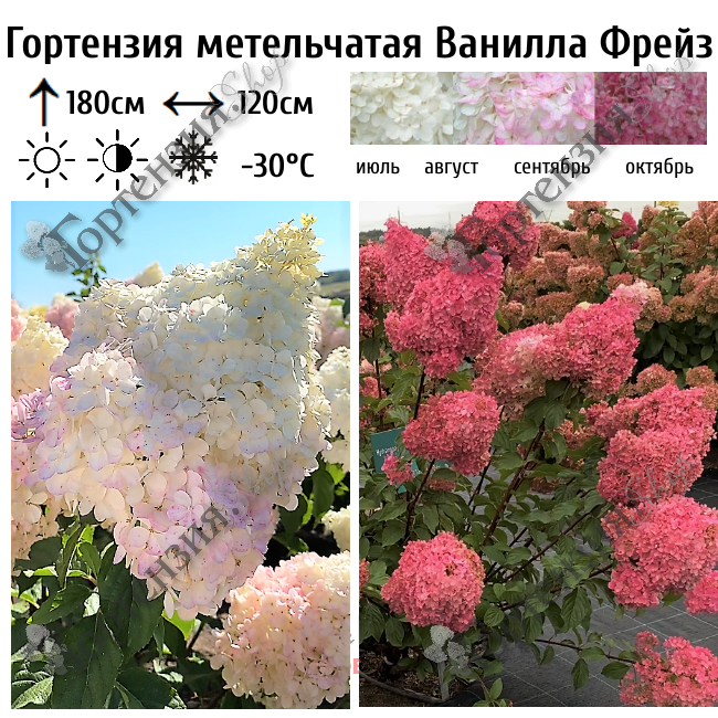 Раскидистый кустарник с мощными и упругими побегами, высота растения в среднем достигает 1,5-1,8м. Побеги имеют насыщенный бордовый оттенок. По всей длине ветвей расположены аккуратные овальные листья. Для соцветий характерна пирамидальная форма, длина каждого составляет около 30 сантиметров. При этом изначально у лепестков белая окраска, но ближе к августу цветки гортензии становятся ярко-розовыми. В начале осени розовый тон меняется на бордово-красный.