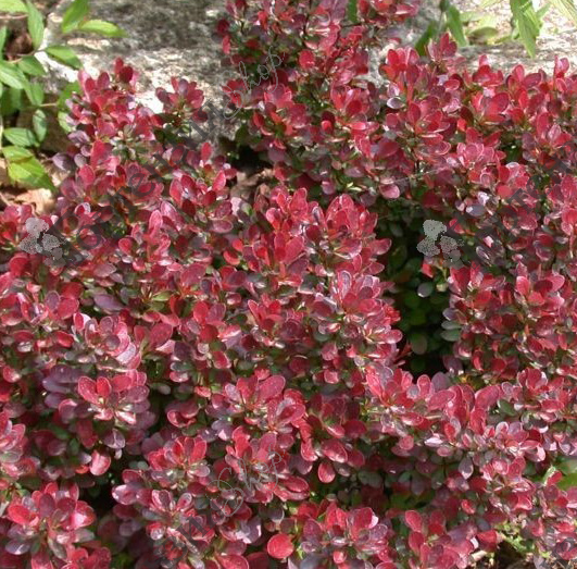Барбарис Тунберга «Антропурпуреа Нана» Berberis thunbergii `Atropurpurea Nana` - карликовый сорт с шаровидной кроной высотой до 0,6 м, диаметром  кроны 1 м.Годовой прирост до 10 см в высоту и 15 см. в ширину..Цветки жёлто-красные, душистые, собраны в повислые кисти.Цветет в мае.Их любят посещать пчёлы, барбарис – отменный медонос.Листья зеленые,осенью пурпурные. Плоды красные. Не требователен. Светолюбив. Засухоустойчив но не выдерживает замокания. Морозостоек.Легко переносит стрижку и обрезку, поэтому растение весьма восстребовано при создании невысоких стриженых изгородей.