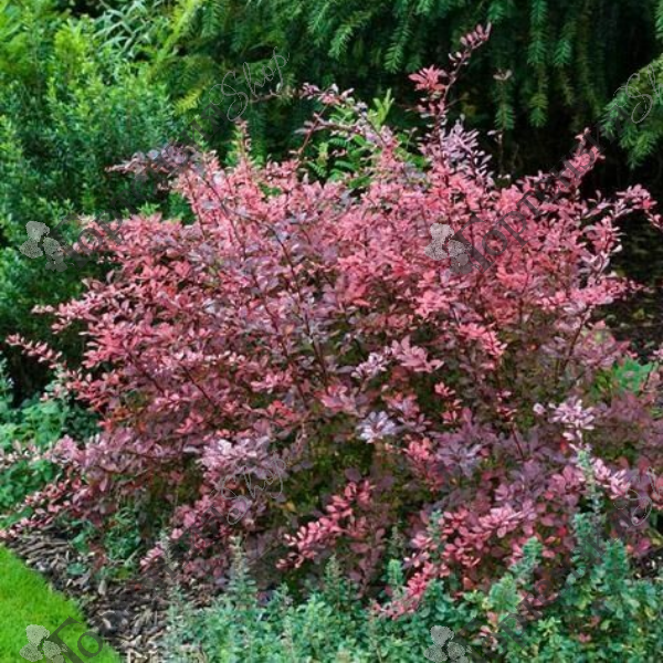 Барбарис Тунберга 'Роуз Глоу' Berberis thunbergii 'Rose Glow' - Поразительно красочный куст высотой и шириной до 1,5 м. Пурпурная листва отлично сочетается с цветами желто-красного цвета, которая распускается уже в мае. Осенью появятся ярко-алые ягоды, а листва перейдет в ярко-оранжевую окраску. Почва дренированная. Предназначен для живых изгородей и цветовых композиций. Cветолюбив, но выносит небольшое затенение. Зимостоек.