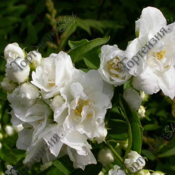 Чубушник Букет Блан - кустарник высотой 180 сантиметров и шириной до 150 сантиметров. Крона округлая, плотная, компактная. Листья темно-зеленые, эллиптическо-яйцевидной формы, на ветвях листья расположены супротивно. Края зубчатые. Цветение длится около месяца в июне-июле. Цветки белоснежные, простые, образованы волнистыми лепестками. Цветки собраны в соцветия по 5- 7 бутонов.