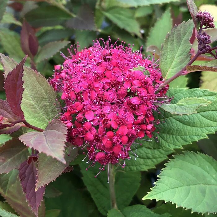 Спирея японская Double Play Doozie (Дабл Плей Дузи) — непрерывноцветущий сорт, цветёт без перерыва с начала лета до осени. Куст компактный, густой, с яркой листвой и обильными красными цветами. Отличный выбор для тех, кто ищет максимально декоративное растение с минимальным уходом. Цветение начинается в июне и продолжается до октября. Соцветия — щитковидные, ярко-красные, не тускнеют на солнце и не требуют удаления отцветших цветков. Молодые листья распускаются с медно-красным оттенком, затем становятся ярко-зелёными, а осенью приобретают оранжево-красную окраску. Благодаря стерильности, куст накапливает силы на непрерывное цветение. Прекрасно подходит для бордюров, клумб, миксбордеров и контейнеров.