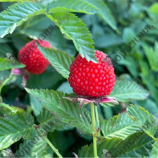 Малино-клубника Земляничная малина Розолин – это уникальный гибрид, сочетающий в себе лучшие качества малины и клубники, также известный как земляничная малина или тибетская малина.  Это не просто растение, а настоящая находка для садоводов, желающих разнообразить свой сад необычными и вкусными ягодами. Розолин представляет собой компактный кустарник, достигающий в высоту 30-60 см.  Он отличается декоративным видом благодаря крупным, морщинистым листьям, похожим на малиновые, и обильному цветению белыми цветами с июня по июль, привлекающими пчел и других опылителей. Главная особенность – это ягоды, напоминающие одновременно и малину, и клубнику. Они ярко-красные, крупные (до 4 см в диаметре), с характерной зернистой поверхностью, как у клубники. Вкус сочетает сладость малины и легкую кислинкую клубники. Аромат насыщенный, фруктовый, с тонкими земляничными нотками. Ягоды можно употреблять в свежем виде, использовать для приготовления варенья, компотов, десертов и замораживать на зиму. Вес у ягоды 5 гр, урожайность небольшая всего 1кг с куста, сбор ягоды начинается в августе и продолжается до заморозков. Растение устойчиво к болезням и вредителям, не требует сложного ухода. Хорошо переносит зимние холода, что позволяет выращивать его в различных климатических зонах. Куст Розолина украсит любой сад своим необычным внешним видом.