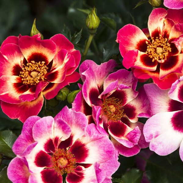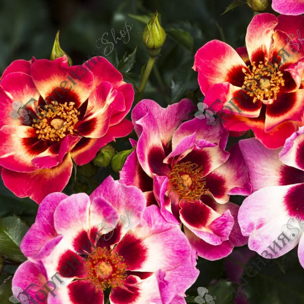 Роза миниатюрная Blushing Babylon Eyes - компактный куст высотой 50-70 см.  Цветки диаметром 6 см, простые (4-8 лепестков), розовые с жёлтым гало вокруг тёмно-красного пятна в основании лепестков. Тональность цветков в процессе цветения меняется. Цветение обильное, повторное в течение сезона. Листва устойчивая к заболеваниям. Рекомендуется как бордюрная, контейнерная или балконная роза.