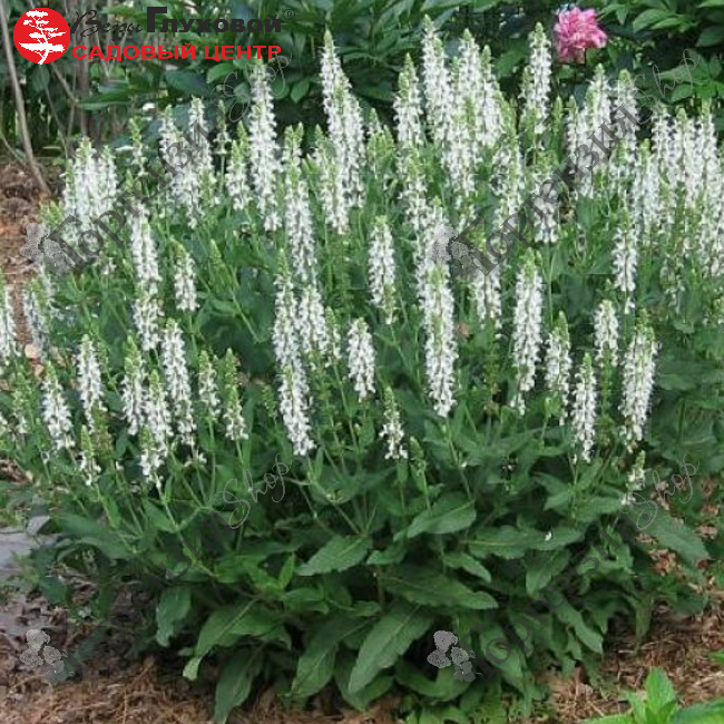 Шалфей дубравный Шнеехугель-травянистый многолетник высотой 50 см, листья крупные, черешчатые, продолговатые, с сердцевидным или округлым основанием, острой верхушкой, городчатые по краю, голые, слегка морщинистые, имеют приятный аромат.  Цветки собраны по 2 - 6 в мутовки, мелкие, длиной около 1 см, белые. Цветет с конца июня до начала сентября.Всего несколько кустиков шалфея и на вашем участке все лето будут гостить бабочки.